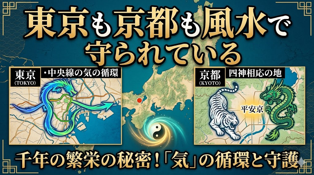 - 江戸(東京): 北の富士山から流れる「龍脈」を重視し、徳川家康は天海大僧正の助言により、寛永寺(上野)や増上寺(芝)を配置して江戸城を風水的に守護しました。